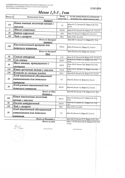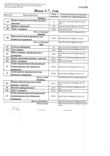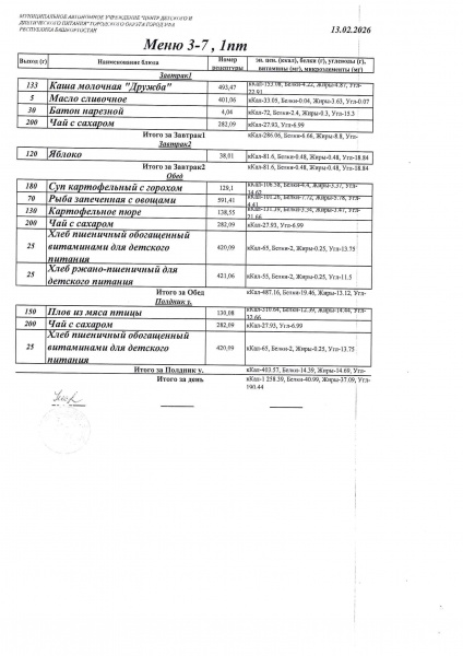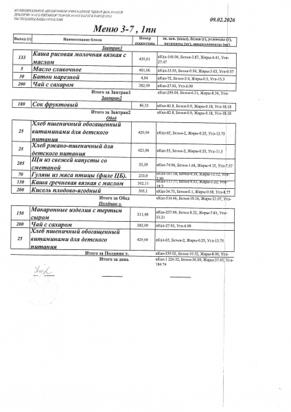 Питание составлено на основе примерного десятидневного меню, используется рекомендованный санитарными правилами СанПиН 2.4.1.3049-13 среднесуточный набор продуктов в возрасте с 2-х до 3-х лет и с 3-х до 7 лет. В течении двух недель ребенок получает все продукты в полном объёме в соответствии с установленными нормами согласно санитарных правил.